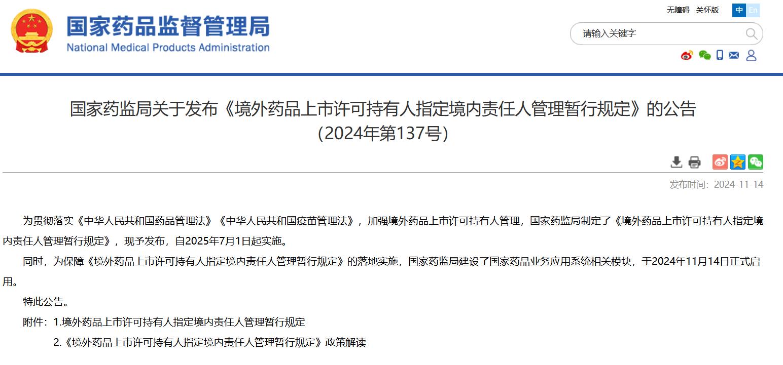 國家藥監(jiān)局關(guān)于發(fā)布《境外藥品上市許可持有人指定境內(nèi)責任人管理暫行規(guī)定》的公告(2024年第137號)