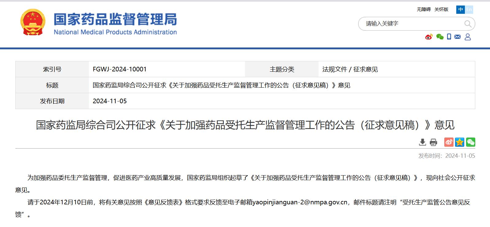 國家藥監(jiān)局綜合司公開征求《關(guān)于加強藥品受托生產(chǎn)監(jiān)督管理工作的公告(征求意見稿)》意見