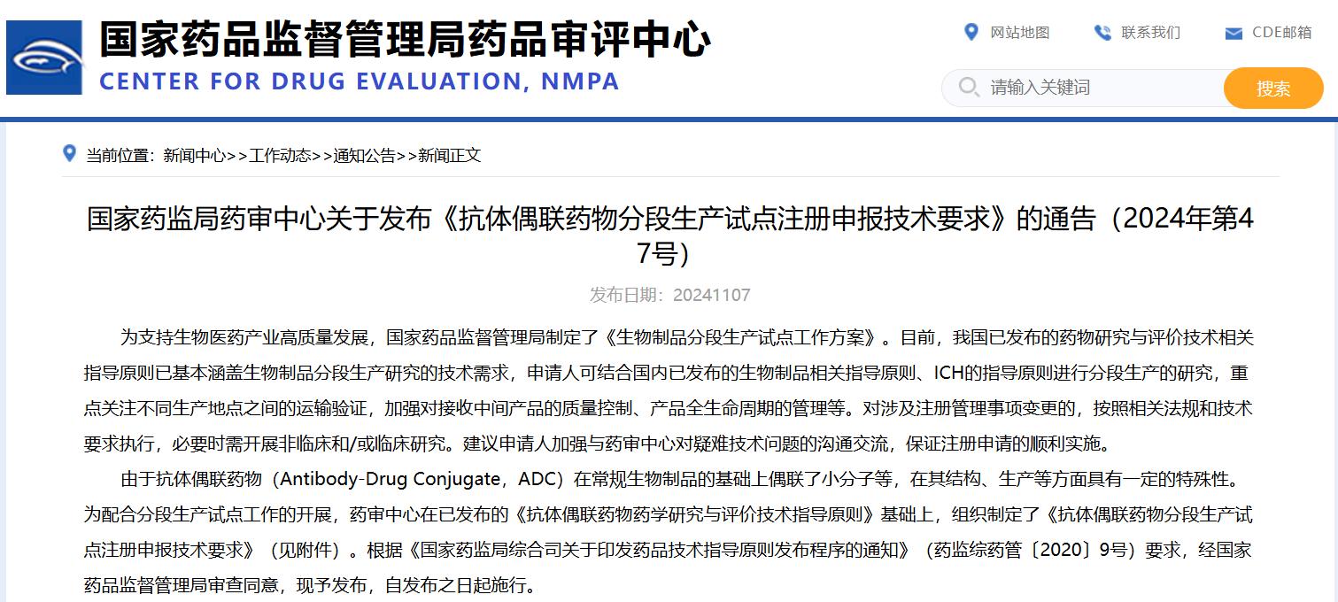 國家藥監(jiān)局藥審中心關(guān)于發(fā)布《抗體偶聯(lián)藥物分段生產(chǎn)試點注冊申報技術(shù)要求》的通告(2024年第47號)