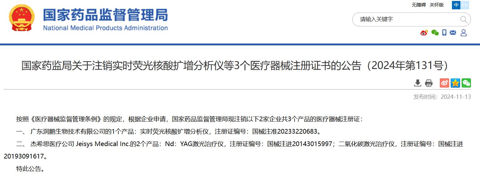 國家藥監(jiān)局關(guān)于注銷實時熒光核酸擴增分析儀等3個醫(yī)療器械注冊證書的公告(2024年第131號)
