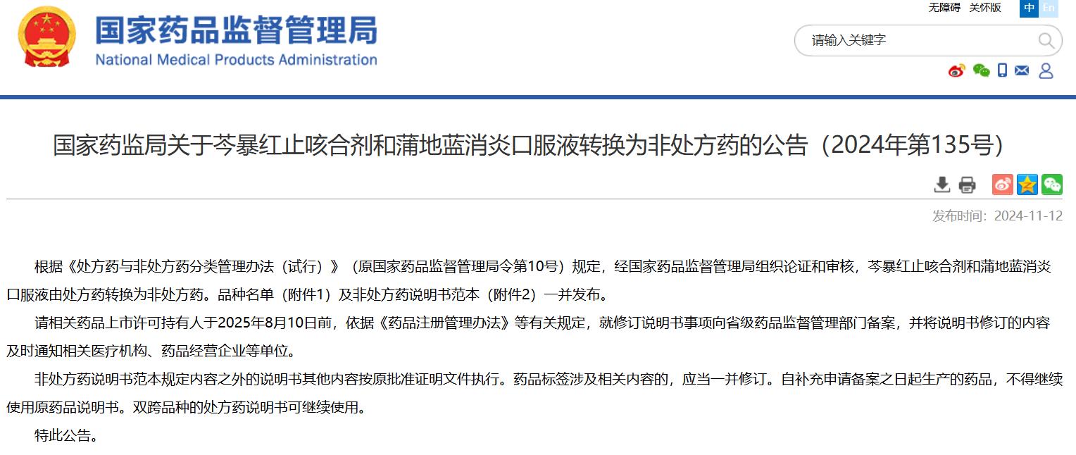 國家藥監(jiān)局關(guān)于芩暴紅止咳合劑和蒲地藍消炎口服液轉(zhuǎn)換為非處方藥的公告(2024年第135號)