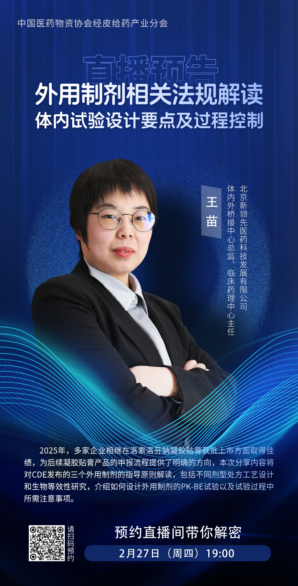 為幫助大家深入理解這些關(guān)鍵內(nèi)容,2月27日(本周四),中國醫(yī)藥物資協(xié)會(huì)經(jīng)皮給藥產(chǎn)業(yè)分會(huì)副會(huì)長單位,北京新領(lǐng)先醫(yī)藥科技發(fā)展有限公司體內(nèi)外橋接中心總監(jiān)、臨床藥理中心主任王苗,為大家?guī)怼锻庥弥苿┫嚓P(guān)法規(guī)解讀,體內(nèi)試驗(yàn)設(shè)計(jì)要點(diǎn)及過程控制》的專業(yè)解讀。王苗主任憑借深厚的專業(yè)知識(shí)和豐富的實(shí)踐經(jīng)驗(yàn),將針對CDE發(fā)布的三個(gè)外用制劑指導(dǎo)原則進(jìn)行深度剖析,包括不同劑型處方工藝設(shè)計(jì)和生物等效性研究;介紹如何設(shè)計(jì)外用制劑的PK-BE試驗(yàn)以及試驗(yàn)過程中所需注意事項(xiàng)。