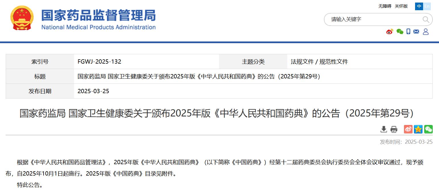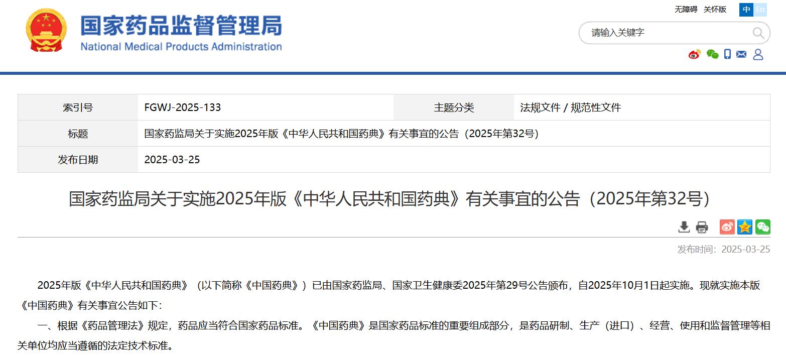 國家藥監(jiān)局關(guān)于實(shí)施2025年版《中華人民共和國藥典》有關(guān)事宜的公告(2025年第32號(hào))