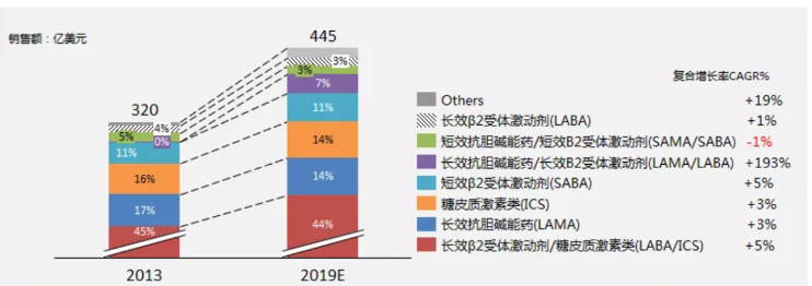 在市場方面,IQVIA報告顯示,2019年全球吸入制劑的市場份額高達480億美元,6年復合增長率為+6.99%。全球吸入制劑藥物的應(yīng)用場景,主要來自支氣管哮喘Asthma/慢阻肺COPD的防治(約93%市場份額)、肺動脈高壓治療,以及吸入麻醉及咳嗽的運用。