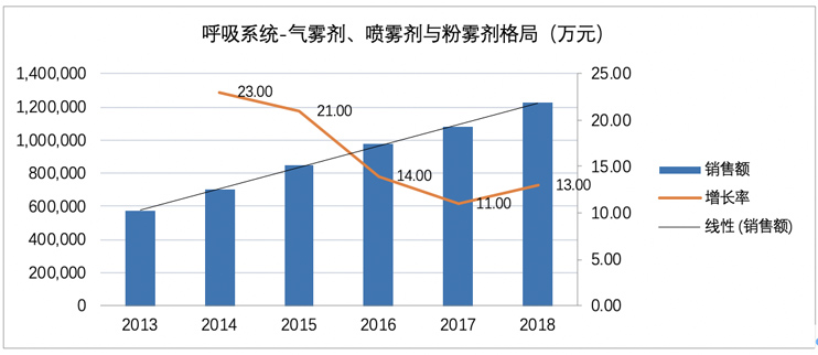 中國城市公立醫(yī)院統(tǒng)計,2018年國內(nèi)氣霧劑、噴霧劑和粉霧劑市場容量為122億元,近5年復合增長率(GAGR)高達+16.38%。