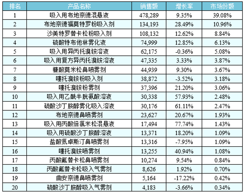 中國市場呈現(xiàn)不同的情況,據(jù)中國城市公立醫(yī)院統(tǒng)計,2018年呼吸系統(tǒng)用藥之氣霧劑、噴霧劑與粉霧劑產(chǎn)品名稱TOP20格局(下表所示)中霧化溶液占62%的市場,粉霧劑占25%,氣霧劑只占2%不到,說明中國吸入制劑市場具有其內(nèi)在的特點,其中霧化吸入溶液代表產(chǎn)品在國內(nèi)均呈增長趨勢。