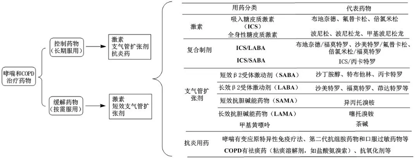 中國及歐美上市治療哮喘和慢性阻塞性肺病的藥物類別主要有:長/短效β2受體激動劑藥物 、長/短效抗膽堿能藥物、糖皮質(zhì)激素、白三烯受體拮抗劑、細胞因子抑制劑等。