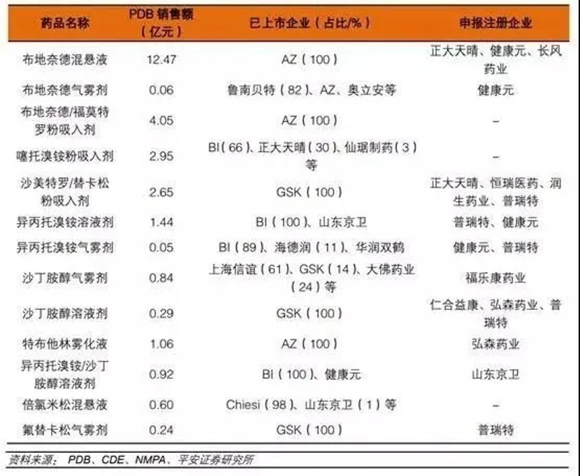 從以上數(shù)據(jù)可知,目前布地奈德混懸液、布地奈德福莫特羅粉吸入劑、沙美特羅替卡松粉吸入劑等重磅品種國內(nèi)僅原研獲批,市場份額完全被原研企業(yè)占據(jù)。國內(nèi)企業(yè)正在積極布局,一旦首仿成功,有望快速實現(xiàn)進口替代。從已上市和研發(fā)布局情況來看,正大天晴、健康元、恒瑞醫(yī)藥、長風藥業(yè)、普瑞特、山東京衛(wèi)、仙琚制藥等處于領(lǐng)先位置。