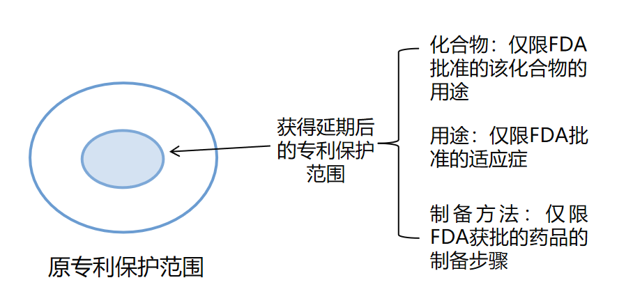 - (1)FDA批準(zhǔn)的藥品專利有效期延長后的保護(hù)范圍小于原專利要求保護(hù)的范圍,如下圖所示: