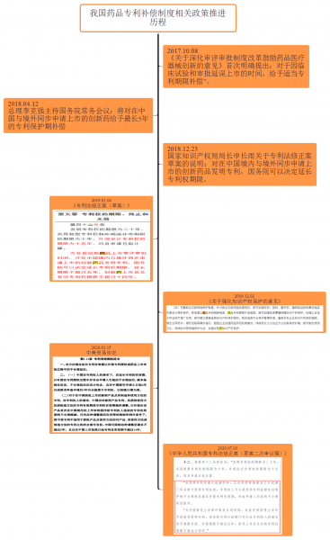 2017年10月《關(guān)于深化審評審批制度改革鼓勵藥品醫(yī)藥器械創(chuàng)新的意見》中首次明確提出對于因臨床試驗(yàn)和審批延誤上市時(shí)間的藥品專利給予適當(dāng)?shù)膶@谙扪a(bǔ)償。2019年1月公開的《專利法修正案(草案)》中提出對于在中國境內(nèi)和境外同步申請上市的創(chuàng)新藥品發(fā)明專利,國務(wù)院可以給予專利期限延長。2020年7月公開的《專利法修正案(草案二次審議稿)》中則修改為對在中國獲批上市許可的新藥發(fā)明專利適當(dāng)給予專利期限補(bǔ)償。