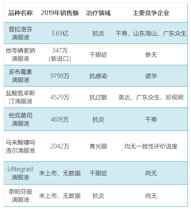 重點開發(fā)冷門產(chǎn)品,可避開激烈的競爭,有望實現(xiàn)首家仿制上市或首家通過一致性評價,搶占市場先機。競爭壓力較小的滴眼液的銷售額和競爭情況如下: