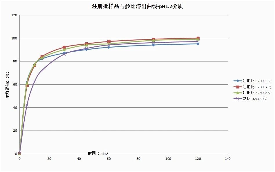 本品種仿制藥開發(fā)的過程,經過逐級放大,工藝驗證三批樣品在pH1.2介質中的溶出略快于BE批次的參比制劑,三批樣品與參比的相似因子均未達到50,曲線圖如下: