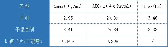 上表給出了給藥劑量均為200mg的前提下,片劑、糖漿、干混懸劑之間的藥動學參數對比,由于糖漿劑劑型比較復雜,受糖漿粘度影響,可能影響體內吸收,暫不做考慮,單純對比片劑以及干混懸劑的藥動學參數,如下: