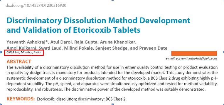 2016年,印度同仁對(duì)溶出度技術(shù)的運(yùn)用已日趨成熟,開始公開撰文?!度艹龆仍囼?yàn)技術(shù)雜志(DissolutionTechnologies)》在該年5月發(fā)表了一篇由印度CIPLA公司研發(fā)人員撰寫的“以依托考昔片為例:如何開發(fā)適度區(qū)分力的溶出方法”文章。