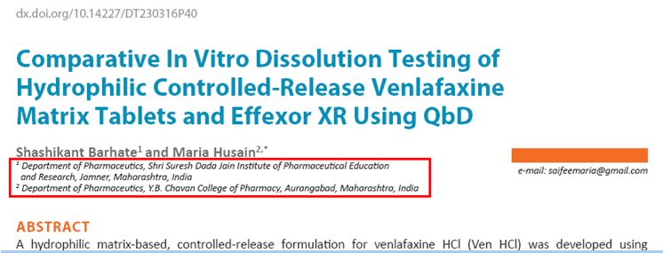 《溶出度試驗(yàn)技術(shù)雜志(DissolutionTechnologies)》2016年8月,又發(fā)表了一篇由印度馬哈拉施特拉邦所屬藥學(xué)院教授和藥物研究所人員撰寫的“溶出方法的QbD:比較文拉法辛控釋片和參比制劑的溶出曲線”一文。