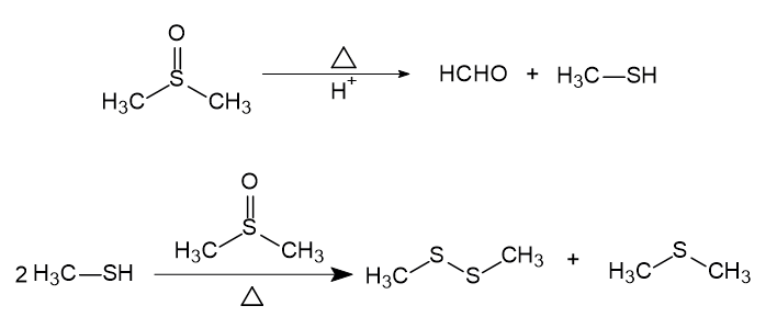 查詢二甲基亞砜穩(wěn)定性相關(guān)文獻(xiàn),報(bào)道二甲基亞砜在酸性條件下高溫加熱會(huì)發(fā)生分解,分解產(chǎn)物主要是甲硫醚(沸點(diǎn)38℃)、二甲基二硫醚(沸點(diǎn)109℃)和甲硫醇(沸點(diǎn)123℃)。