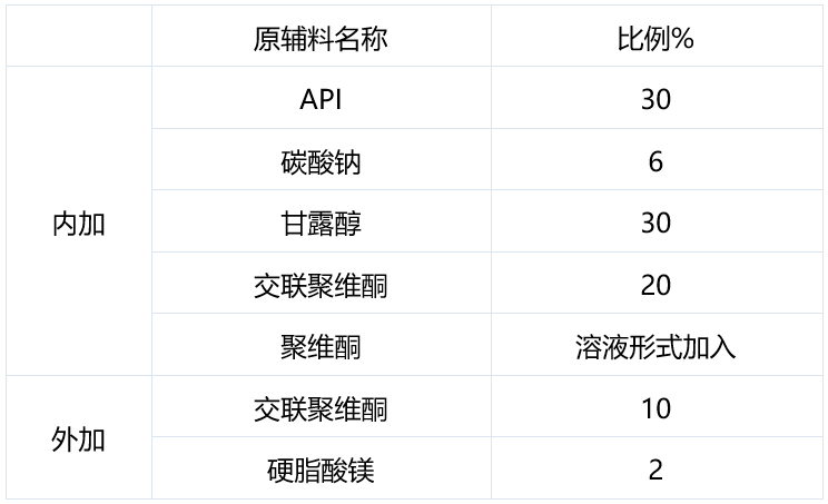2)稱量: 稱取處方量的原料藥、甘露醇、交聯(lián)聚維酮(內(nèi)加)、無(wú)水碳酸鈉備用;
