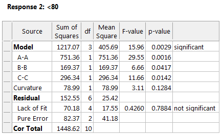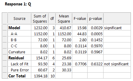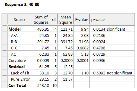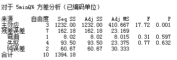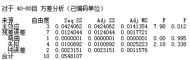 結(jié)論: 通過(guò)模型優(yōu)化能獲得 整體模型主效應(yīng)P<0.05,模型有效,未出現(xiàn)明顯彎曲及失擬現(xiàn)象。 (以上數(shù)據(jù)為通過(guò)minitab及design expert軟件相互印證證明模型有效性)