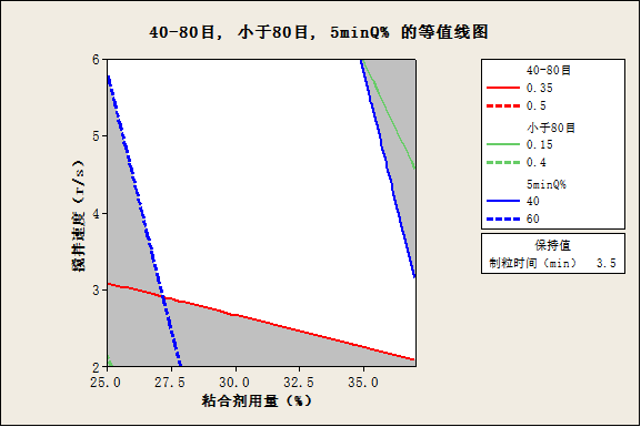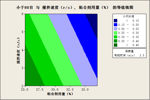 圖: 粘合劑和攪拌速度對(duì)小于80目粒度分布的影響趨勢(shì)(制粒時(shí)間3.5min)