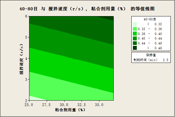 圖: 粘合劑和攪拌速度對(duì)40-80目粒度分布的影響趨勢(shì)(制粒時(shí)間3.5min)