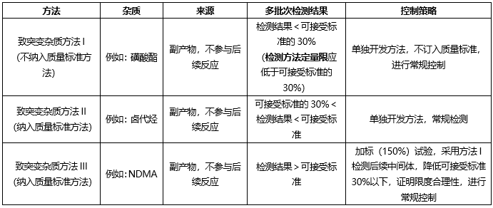 我們開發(fā)致突變雜質(zhì)相關(guān)方法檢測上述致突變雜質(zhì),雜質(zhì)控制策略如下: