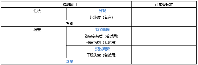 *藍色字體,標準中必須包含項目,黑色字體根據(jù)實際檢測結(jié)構(gòu)確定是否增訂入質(zhì)量標準