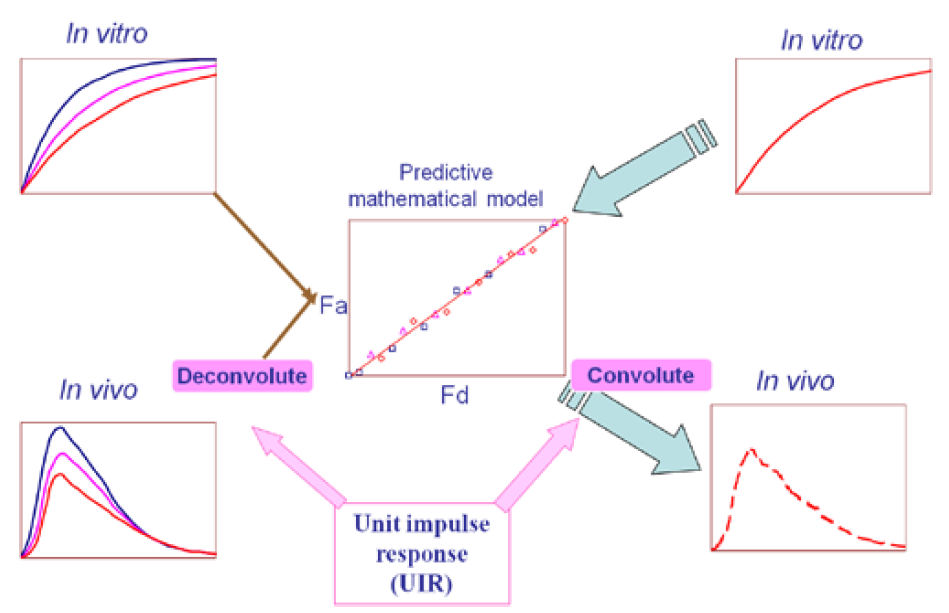 體內(nèi)外相關(guān)性模型,用IVIVR(in-vivo and in-vivo relationship)來表示,即將藥品的體外特性(主要為溶出曲線)和體內(nèi)特性(藥動學)建立相關(guān)性。根據(jù)體外溶出數(shù)據(jù),預測藥物的在體內(nèi)的藥動學曲線,該方法為卷積法。相反,利用藥物的吸收曲線,可預測藥物在體內(nèi)的溶出,該方法為反卷積法,如下圖所示: