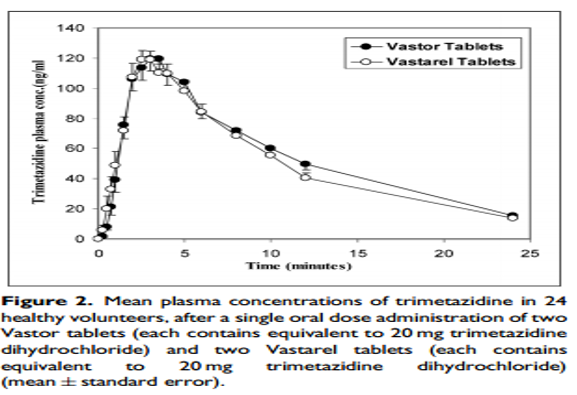 參考文獻[6]“In vitro dissolution and in vivo bioequivalence evaluation of two brands of trimetazidine tables”,鹽酸曲美他嗪片的藥動學曲線如下: