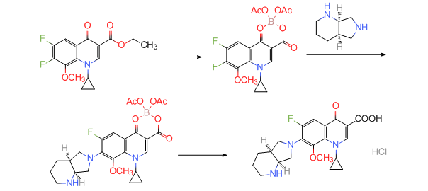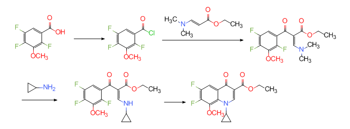 片段二為8-甲氧基氟喹諾酮類結(jié)構(gòu),以1-環(huán)丙基-6,7-二氟-1,4-二氫-8甲氧基-4-氧代-3-喹啉羧酸乙酯(CAS:112811-71-9)起始原料反應(yīng)制得,其合成路線如下: