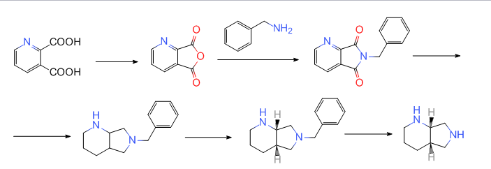 從結(jié)構(gòu)來看主要由兩個片段組成,片段一為(S,S)-2,8-二氮雜二環(huán)[4,3,0]壬烷(CAS:151213-40-0),作為本品合成的起始原料之一;合成路線如下: