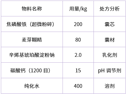 由于焦磷酸鐵在食品營養(yǎng)強化中用途廣用量大,結合工業(yè)化方便、經濟的生產實際特點,本人在生產實踐中采用噴霧干燥法,以糖類物質為壁材,采用微膠囊化技術對普通焦磷酸鐵原料進行包埋處理,處理后的焦磷酸鐵性狀呈現(xiàn)小顆粒狀細粉,流散性好,加工性能(混合均勻性)得以提高,同時焦磷酸鐵經過微膠囊化包埋處理,避免了與植物蛋白直接接觸誘發(fā)酸敗。