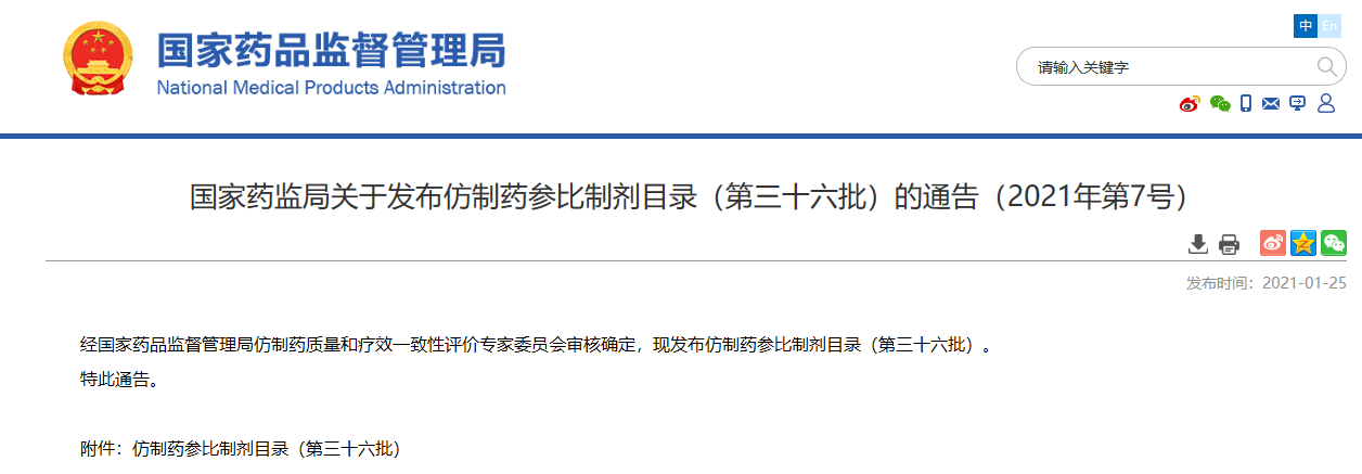 關于發(fā)布仿制藥參比制劑目錄(第三十六批)的通告(2021年第7號)