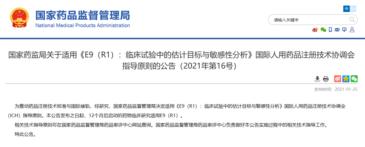 關于適用《E9(R1):臨床試驗中的估計目標與敏感性分析》國際人用藥品注冊技術(shù)協(xié)調(diào)會指導原則的公告(2021年第16號)