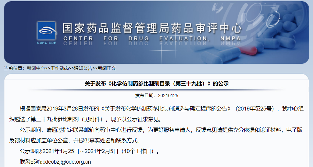 關于發(fā)布《化學仿制藥參比制劑目錄(第三十九批)》的公示