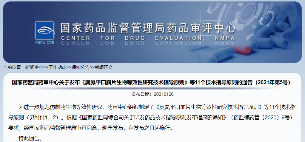 關于發(fā)布《奧氮平口崩片生物等效性研究技術(shù)指導原則》等11個技術(shù)指導原則的通告(2021年第5號)
