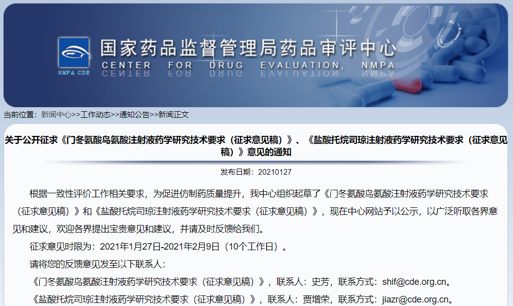 關于公開征求《門冬氨酸鳥氨酸注射液藥學研究技術(shù)要求(征求意見稿)》、《鹽酸托烷司瓊注射液藥學研究技術(shù)要求(征求意見稿)》意見的通知