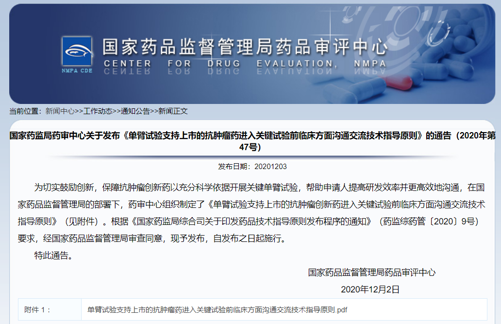 發(fā)布《單臂試驗(yàn)支持上市的抗腫瘤藥進(jìn)入關(guān)鍵試驗(yàn)前臨床方面溝通交流技術(shù)指導(dǎo)原則》的通告(2020年第47號(hào))