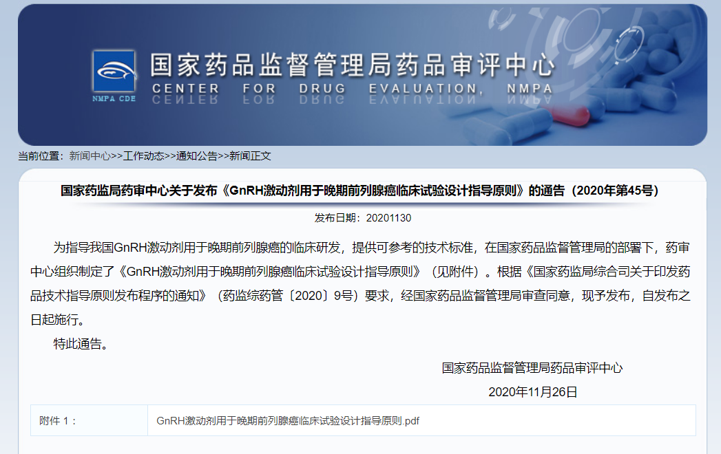 關(guān)于發(fā)布《GnRH激動(dòng)劑用于晚期前列腺癌臨床試驗(yàn)設(shè)計(jì)指導(dǎo)原則》的通告(2020年第45號(hào))