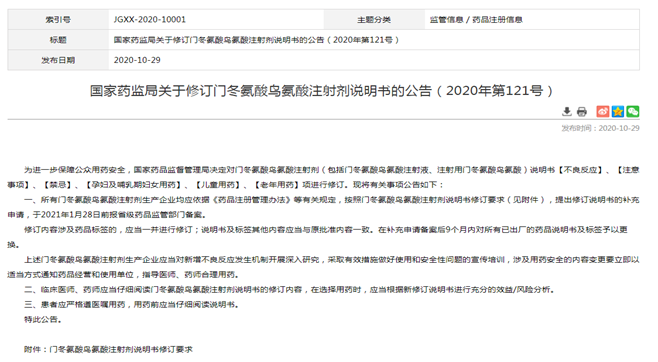 為進一步保障公眾用藥安全,國家藥品監(jiān)督管理局決定對門冬氨酸鳥氨酸注射劑(包括門冬氨酸鳥氨酸注射液、注射用門冬氨酸鳥氨酸)說明書項進行修訂,各持有人須參照修訂要求,提出修訂說明書的補充申請,于2021年1月28日前報省級藥品監(jiān)管部門備案,并在補充申請備案后9個月內(nèi)對所有已出廠的藥品說明書及標簽予以更換。