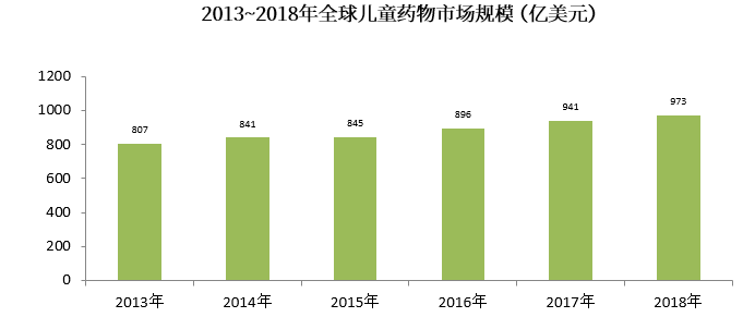 2013年~2018年全球兒童藥物市場規(guī)模呈逐年上升趨勢,近5年復(fù)合增長率(CAGR)為3.76%,2018年全球兒童藥物市場規(guī)模約為973億美元。