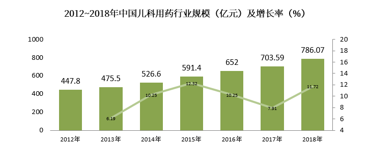 國內(nèi)市場兒童藥物規(guī)模與國際市場相匹配,2012年~2018年CAGR為+9.83%,2018年我國兒科用藥市場規(guī)模約為786.07億元,較上年同比增長11.72%,國內(nèi)兒科用藥市場規(guī)模增長迅速。