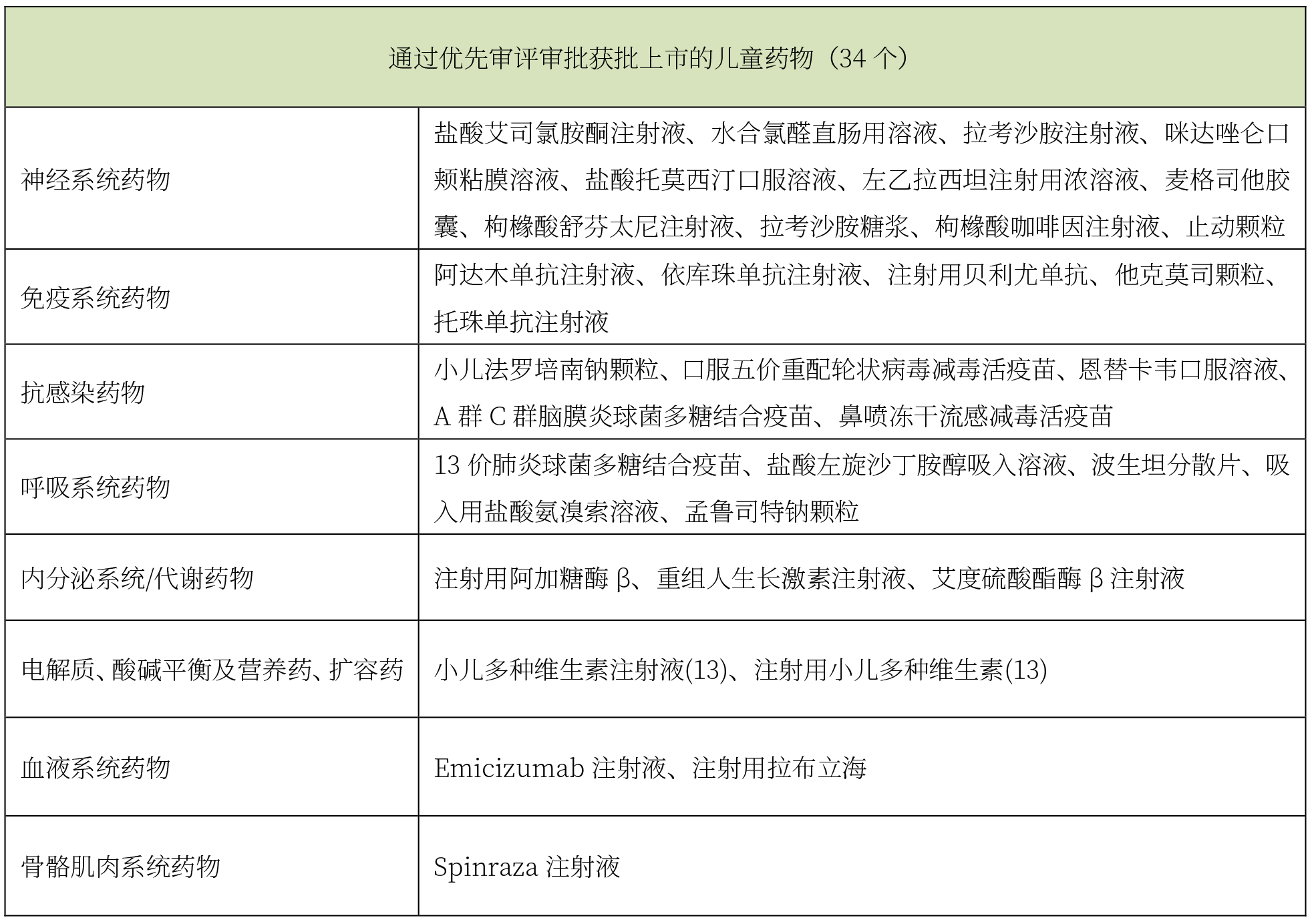 在兒童藥物優(yōu)先審評審批方面,2016-2019年國家局已陸續(xù)將989個品種納入優(yōu)先審評程序中,其中兒童藥物96件(占比為9.7%),已有80多個企業(yè)享受優(yōu)惠政策。截至目前,通過兒童用藥優(yōu)先審評審批上市的產(chǎn)品共計34個,詳見下表。