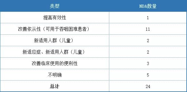 經(jīng)查詢美國審評綜述,本領(lǐng)域獲批的24個新劑型/新制劑中,4個品種為注射劑,20個品種為口服制劑,總體而言仍然以口服制劑為主。不同品種改良優(yōu)勢匯總?cè)缦?,主要改良?yōu)勢為改善依從性(可用于吞咽困難患者)和增加兒童制劑為主。
