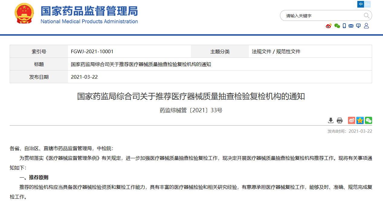 國家藥監(jiān)局綜合司關(guān)于推薦醫(yī)療器械質(zhì)量抽查檢驗復檢機構(gòu)的通知