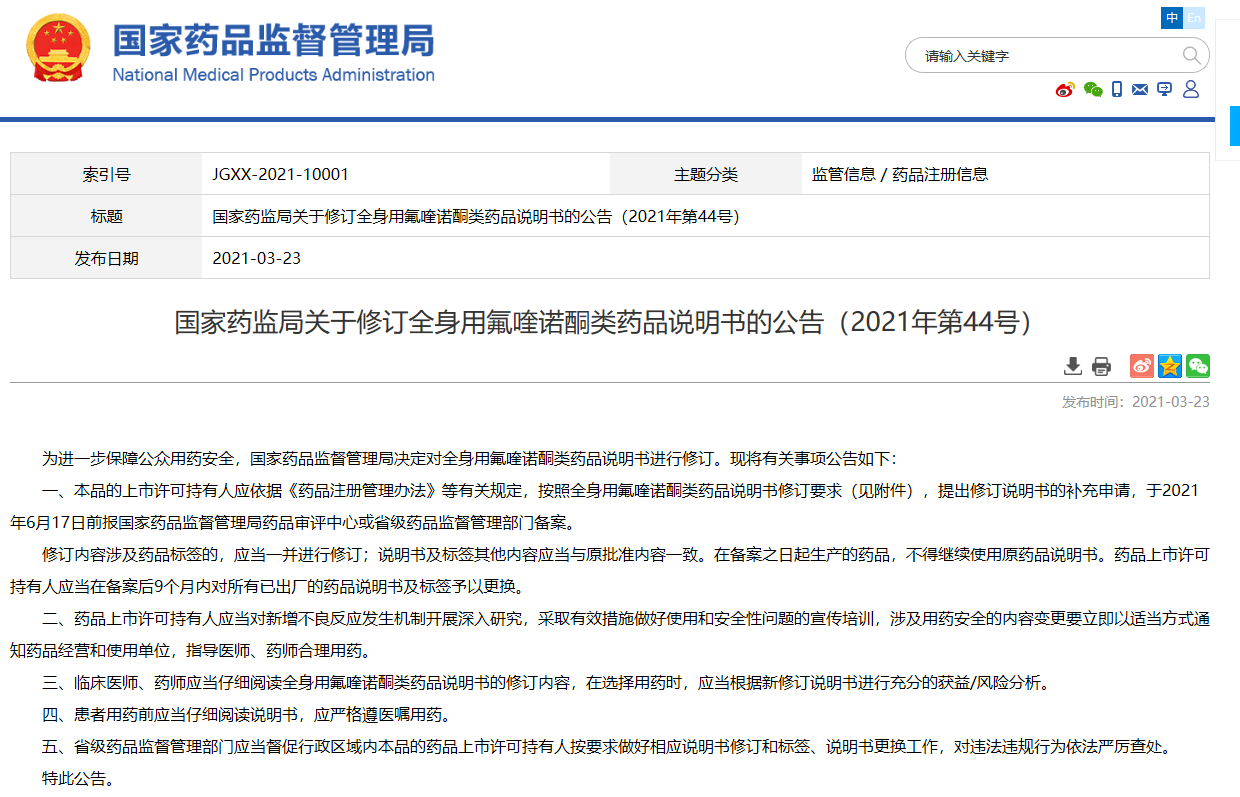 國家藥監(jiān)局關(guān)于修訂全身用氟喹諾酮類藥品說明書的公告(2021年第44號)