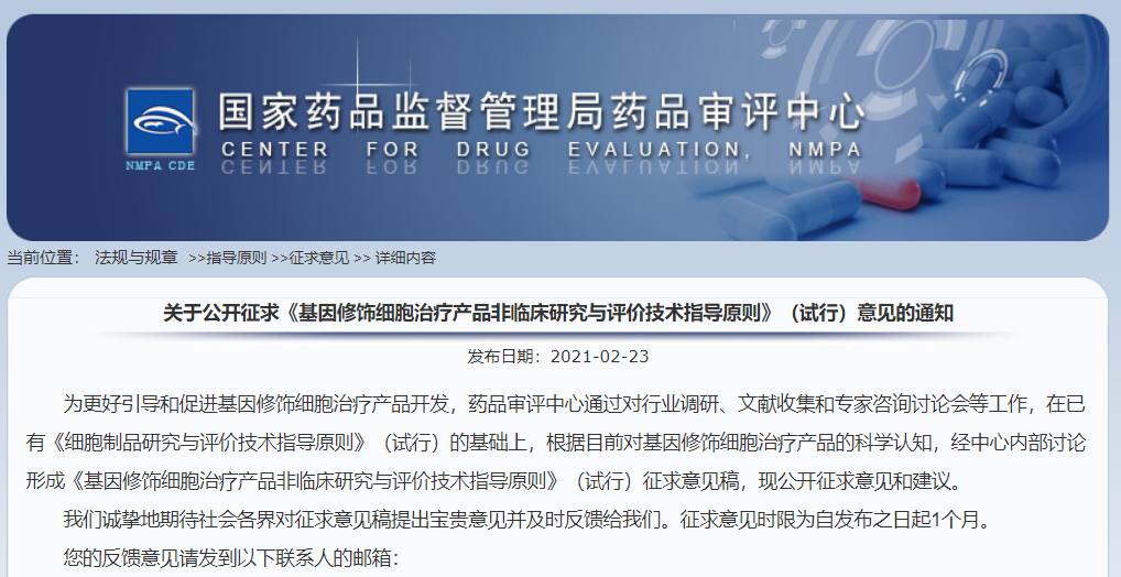 關(guān)于公開征求《基因修飾細胞治療產(chǎn)品非臨床研究與評價技術(shù)指導原則》(試行)意見的通知