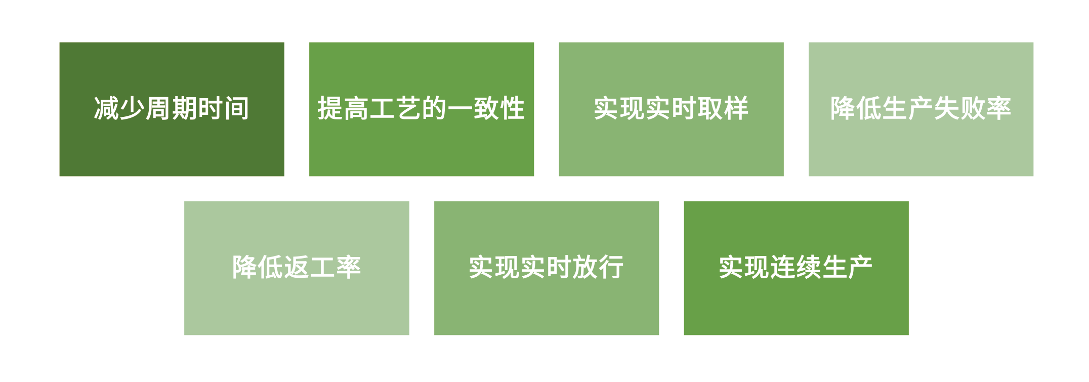 在生產(chǎn)過程中通過使用PAT可加速放行測試時間,進(jìn)而達(dá)成以下產(chǎn)品實(shí)現(xiàn)目標(biāo):