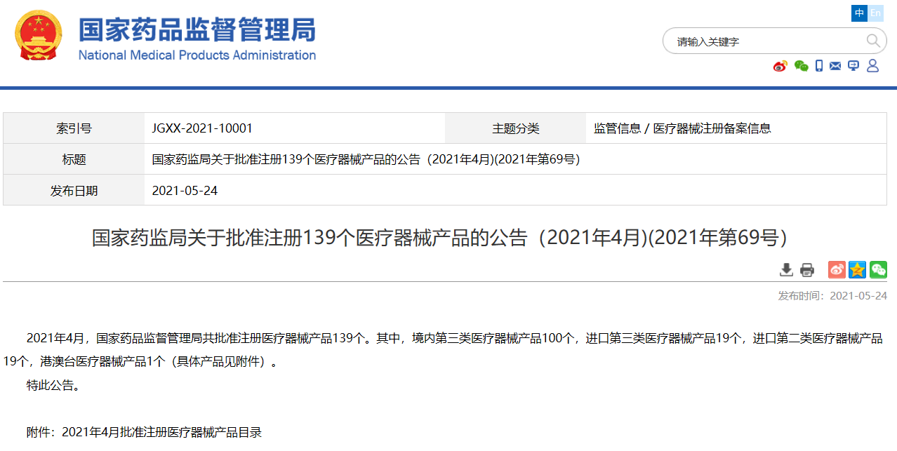 國家藥監(jiān)局關(guān)于批準(zhǔn)注冊139個醫(yī)療器械產(chǎn)品的公告(2021年4月)(2021年第69號)