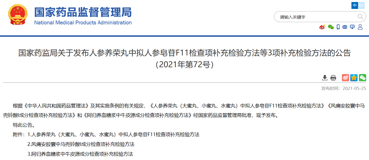 國家藥監(jiān)局關(guān)于發(fā)布人參養(yǎng)榮丸中擬人參皂苷F11檢查項(xiàng)補(bǔ)充檢驗(yàn)方法等3項(xiàng)補(bǔ)充檢驗(yàn)方法的公告(2021年第72號)