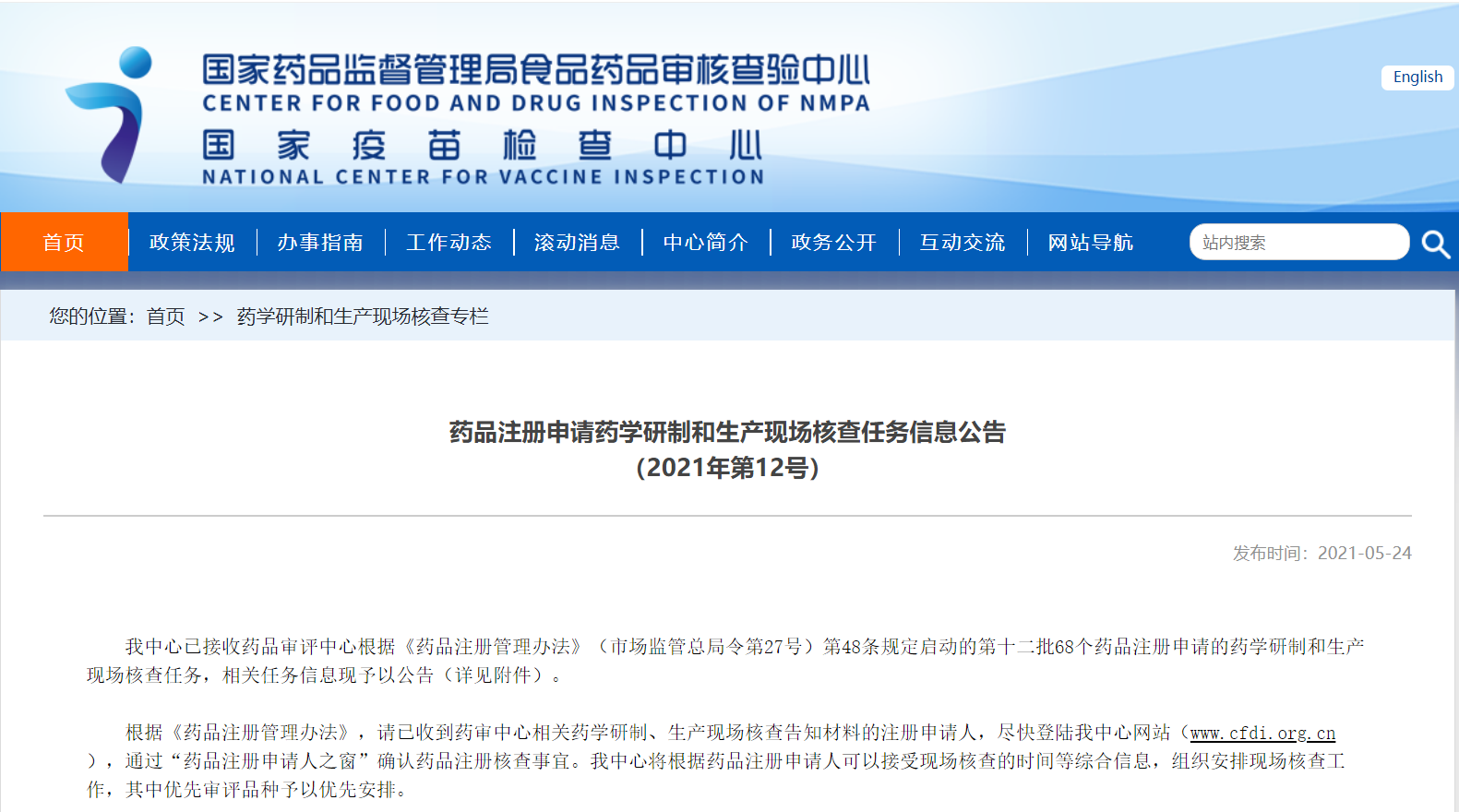 藥品注冊申請藥學(xué)研制和生產(chǎn)現(xiàn)場核查任務(wù)信息公告(2021年第12號)
